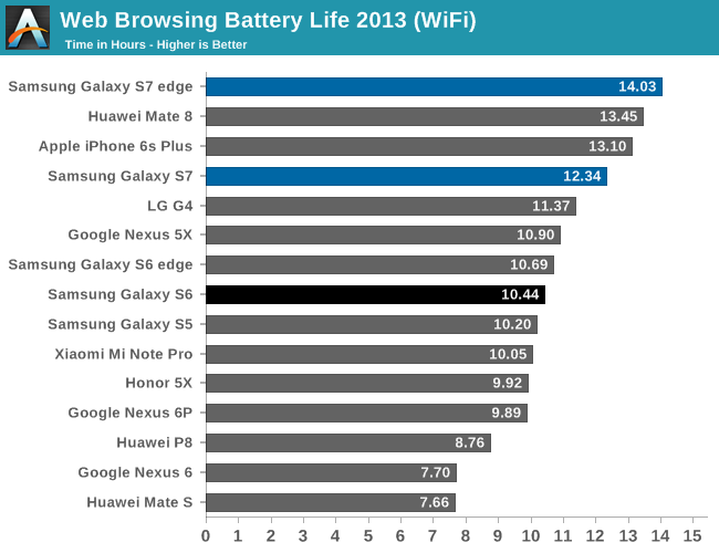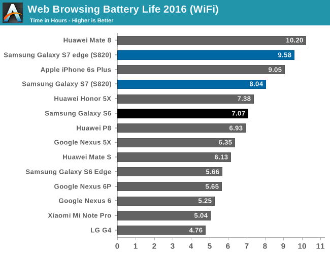 最新的2016 Wi-Fi测试中,S7 Edge坚持了9个半小时,仅次于神一般的华为Mate 8,S7也超过了8个小时,都相当理想。