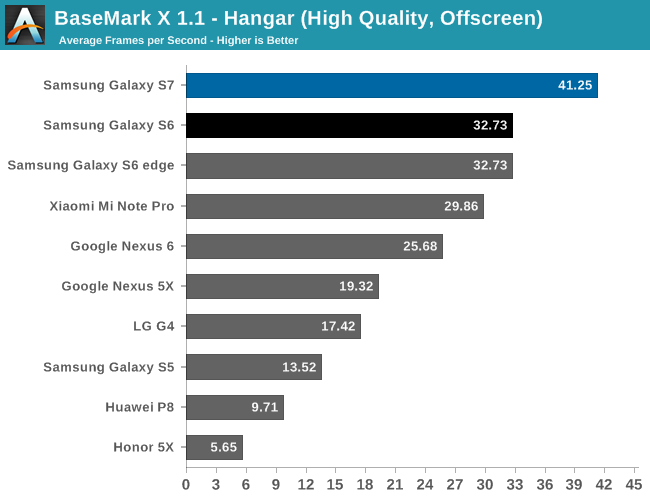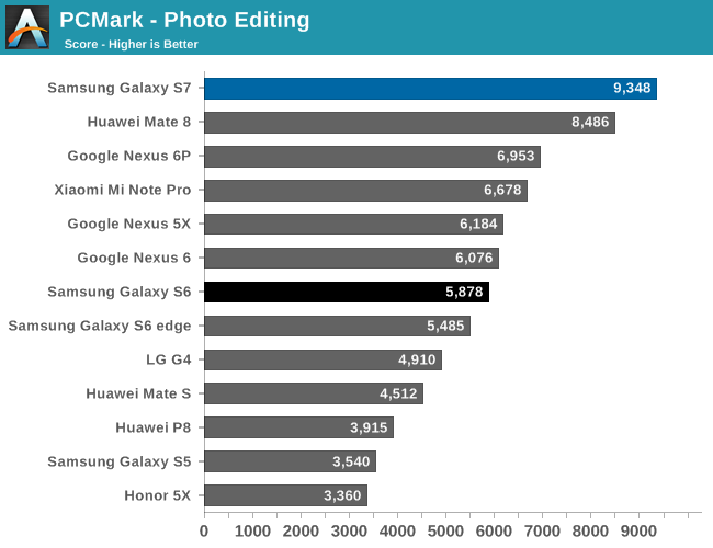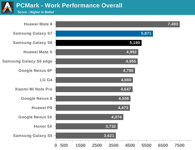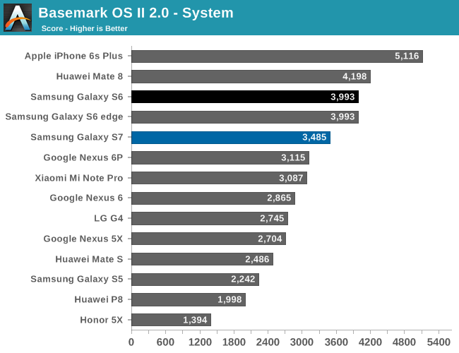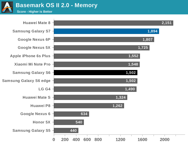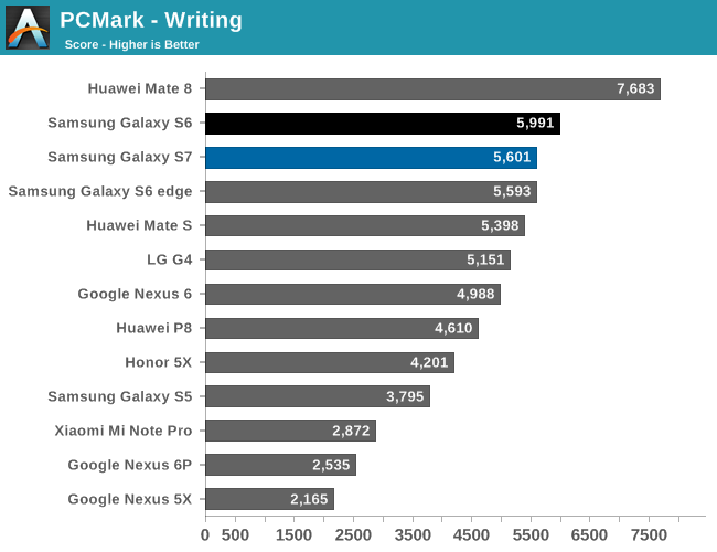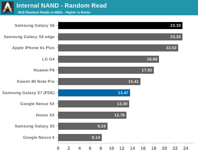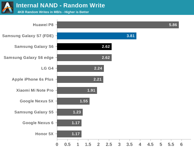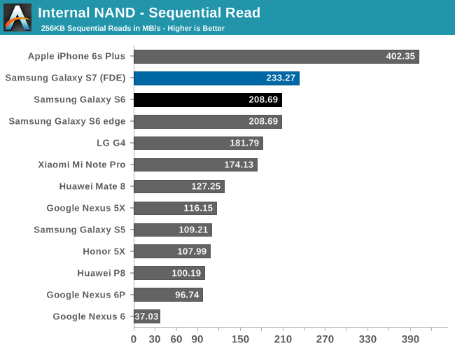 顺便看看AnandTech的闪存测试。S6、S7使用的都是UFS 2.0存储,理论上不会差太多。S7的闪存被识别为“KLUBG4G1CE-B0B1”,看上去和S6的来自同一家族。