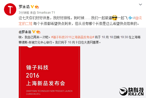锤子科技和罗永浩已经双双确认,将于10月18日晚19点半在上海梅赛德斯-奔驰文化中心举办新品发布会,吊足了胃口、让人望眼欲穿的T3终于要来了。