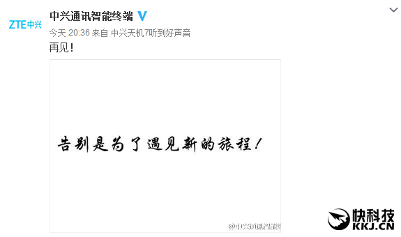 今日晚间,@中兴通讯智能终端 官方微博突然说了两个字“再见!”,而配图里也只有一句话:“告别是为了遇见新的旅程!”