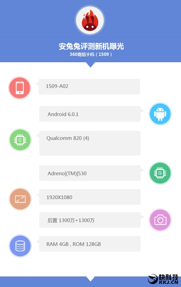 今天,安兔兔数据库收到了一款代号为QK1509—A02的奇酷新机,手机搭载高通骁龙820处理器,采用4GB内存+128GB存储设计,屏幕分辨率未1080p(尺寸未知),后摄像头依然为双1300万像素。