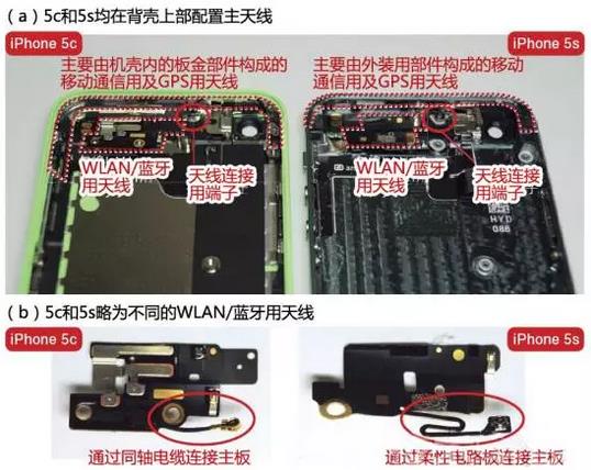 技术人员通过对iPhone 5s和iPhone 5c拆解分析,移动通信、无线LAN/蓝牙和GPS用三种天线集成在机身上部,移动通信用的子天线位于机身下部。