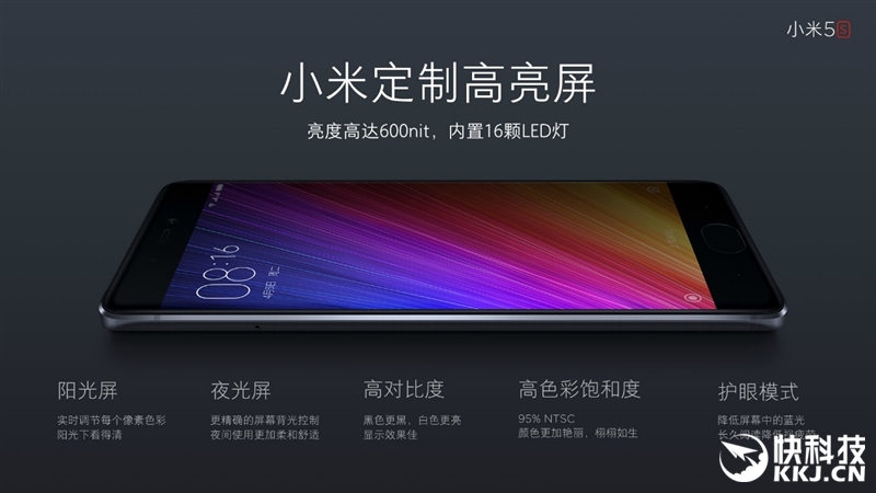 小米5S的屏幕也值得一提,采用了定制高亮屏,最高亮度达600尼特,因为内置了16颗LED,同时对比度和色彩饱和度也不错,NTSC色域覆盖范围95%。