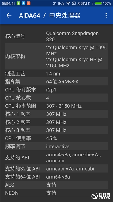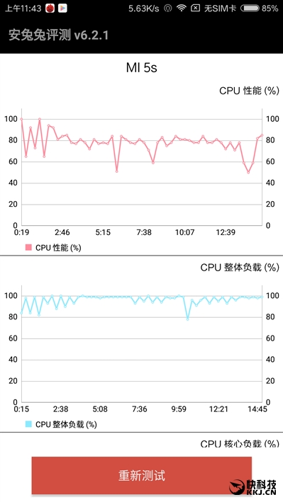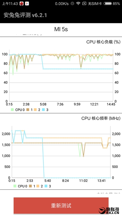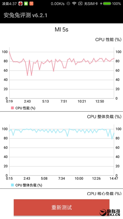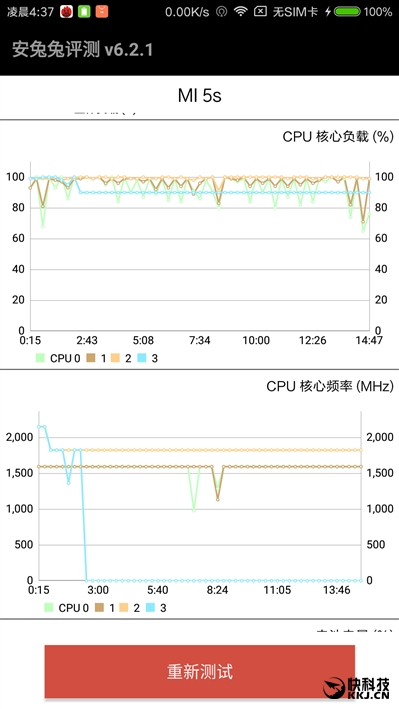 从负载情况看,四个核心都在持续高速运转,其中两个大核心分别稳定在100%、90%,两个小核心则在80-100%范围内波动,由此可见小米5S的策略是在降低一定频率的情况下持续运行,这也是个不错的策略,比大幅降频、不停波动要好一些,有利于保证性能稳定和持续性。