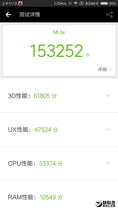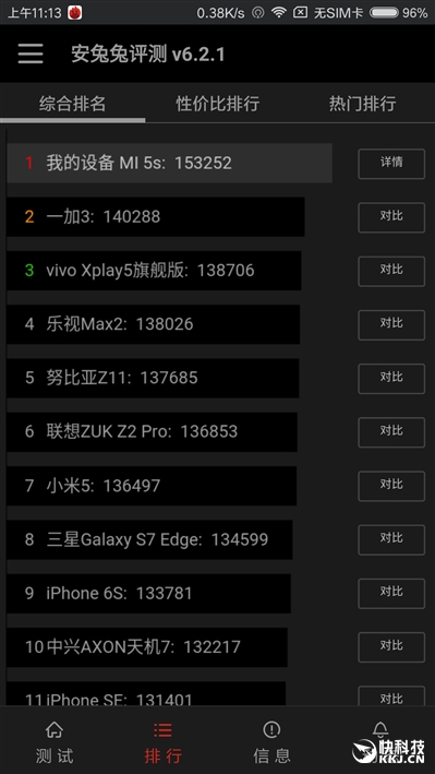 安兔兔实测,小米5S最高跑出了15.3万分的好成绩,而骁龙820在最好的情况下也只能刚刚超过14万分,同时距离满血骁龙821 16万分出头的成绩也相差不大。这说明部分降频的小米5S仍然有着比小米5更好的性能。