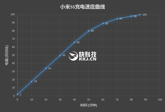 半小时充入50%,一小时充入90%,速度相当快,最后花了大约85分钟就充满了。