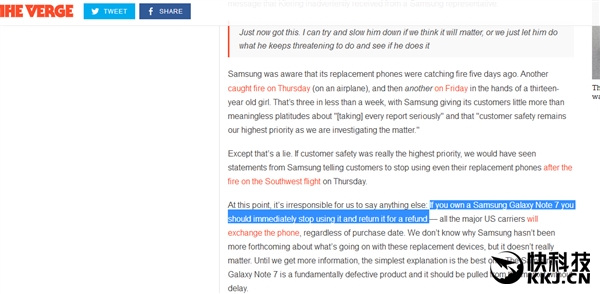 也正是因此,TheVerge和Phone Arena都旗帜鲜明地站出来,希望消费者们立即放下手中的Note7退货或者换其他型号,不要再使用了