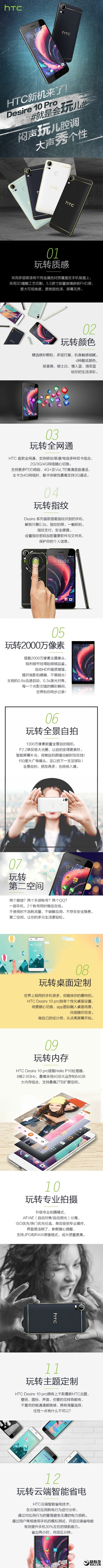 HTC Desire 10 Pro采用金属机身、5.5寸1080p屏幕、联发科Helio P10处理器、3/4GB内存、32/64GB可扩展存储、2000万像素后置和1300万像素前置摄像头、3000mAh电池和快充、双卡双待4G全网通、High-Res音频、安卓6.0。