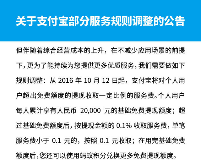 支付宝今年9月发布了服务规则调整公告。该公告显示:从2016年10月12日起,支付宝将对个人用户超出免费额度的提现收取一定比例的服务费。