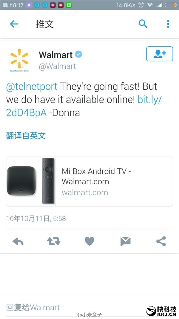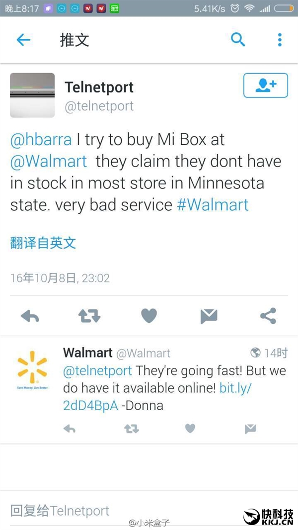 有美国网友在推特上抱怨说,明尼苏达州的几乎所有沃尔玛商店里都没有小米盒子,沃尔玛的服务也太差劲了。