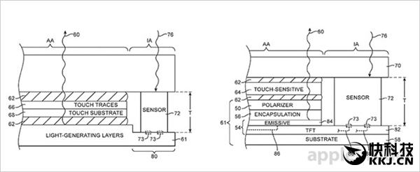 苹果建议在显示屏层上排列传感器。大多数具体实现在OLED或LCD显示屏层上排列传感器的技术,部分具体实现把传感器排列在设备显示屏周围,避免引发显示屏触摸不灵敏问题。