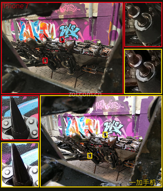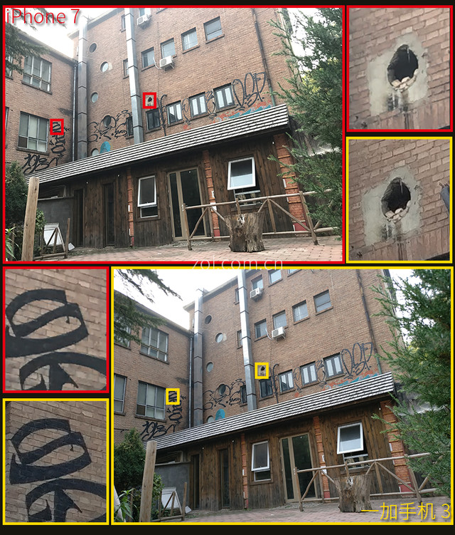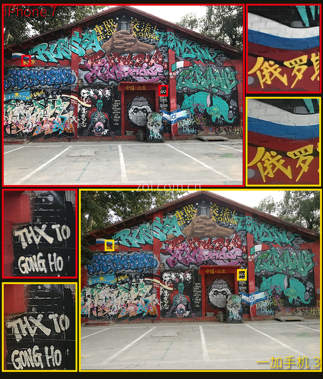 上图是室外色彩样张,这张能看到iPhone 7对于墙面白字的还原更准确,另外还能发现一加3仍在解析力上有优势,经过了几张的对比还可以发现,一加3的解析力优势其中一部分来自于边缘锐化。