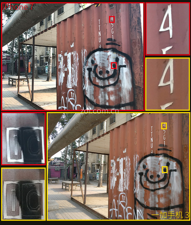 上面的样张可以发现对于旧集装箱的色彩还原两机又出现了差异,但参考远处场景,能看出一加3对于清晨淡黄色阳光还原更准确,氛围感更强,iPhone 7有点“假”了。另外,一加3的解析力继续保持连胜。