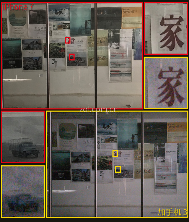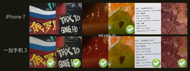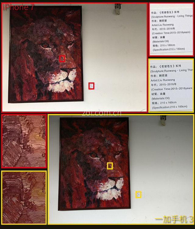 然后来到室内,光照条件不再像室外那么理想,可以见到一加3在解析力尚优势明显,一加3的图中,作品介绍文字完全可以辨识,iPhone 7已经模糊了。油画上也是一加3的笔迹更清晰。