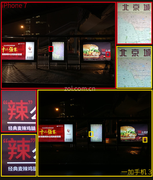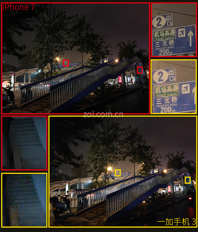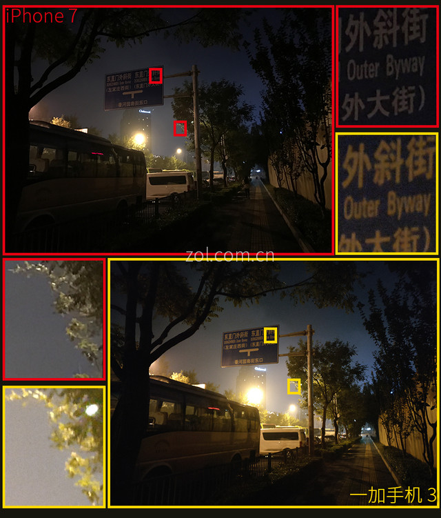 夜晚成像(暗光场景),两机均配备防抖功能,但一加手机3由于光圈上的劣势,需要通过提高ISO感光度来提升画面亮度,如此做会令画面出现噪点,纯净度不如iPhone 7。另外,iPhone 7更倾向于牺牲一点画面亮度以低ISO感光度打造更为纯净的画面,所以记录夜晚场景,若为JPG直出不打算后期调整的话,一加手机3画面更亮,对物体的辨识更为轻松,同样还是适合晒照分享。