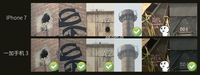 上面砖楼的样张,可以见到一加3凭借更高的1600万像素在解析力方面实现了三连胜,参照左下角黑色字母部分,一加3仍可见砖缝,但iPhone 7完全是黑色了。动态范围方面,在保证楼前暗部细节的前提下,两机天空部分全部过曝,动态范围没有体现出差距。