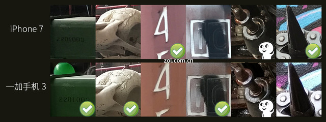 “打勾”代表细节更清晰,“懵逼”表示打个平手。光线充足18个场景下,一加手机3赢了12次,18个场景懵逼2次分不出胜负;暗光样张中,一加3只赢了3次,其中包括一次对焦物体足够亮。