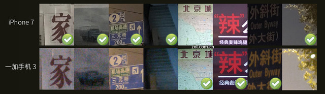 样张中可以看到放大细节的路牌,一加3明显更易辨认,字体更加清晰,但iPhone 7则需要费点眼力才能看清字迹,所以在这种场景下假如是为了拍照记录信息,那么一加3还是可以赢过iPhone,因为记录信息并不牵扯艺术创作,看得清才是最重要的。