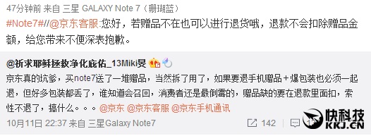 还好,京东很快意识到了这个问题。@京东客服 回应称,如果赠品不在了,也可以进行退货,退款时也不会扣除赠品金额。
