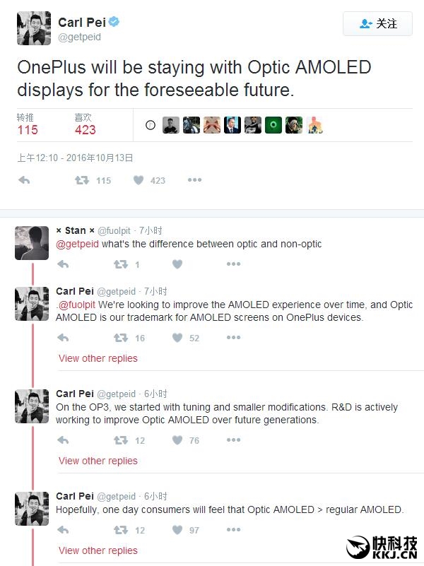 一加创始人@Carl Pei今天在推特上连续发布消息,称一加在可预期的未来会坚守Optic AMOLED屏幕,并将不断改进体验。