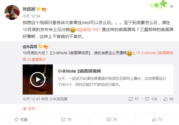 最近一段时间,微博上关于小米Note 2的消息非常多。而最新曝光的消息则显示,该机还有望采用曲面屏。