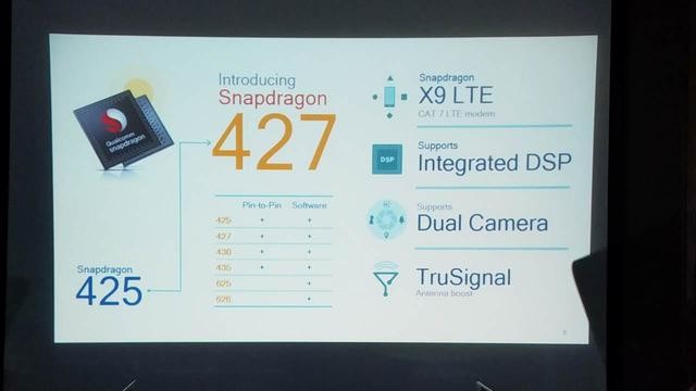 骁骁龙427为骁龙425的延伸,采用28nm工艺,与骁龙425/430/435管脚和软件兼容,与骁龙625和626软件兼容,并且是首款TruSignal引入骁龙400系列处理器的芯片组,2017年第一季度商用。