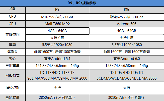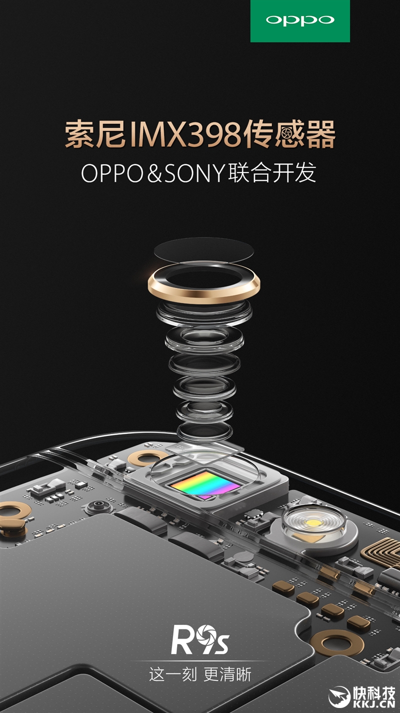 跟R9相比,这次R9s在配置上的提升主要集中在处理器和摄像头,依然采用5.5英寸1080p屏幕(超窄黑边设计,外层覆盖的是大猩猩5代玻璃),4GB RAM+64GB存储的内存组合,处理器是基于14nm工艺的高通骁龙625(主频2GHz),内置3010mAh容量电池(支持VOOC闪充,经典广告词充电五分钟通话两小时乱入...),运行基于Android 6.0的ColorOS 3.0,摄像头为双1600万像素,其中后置为索尼和OPPO定制研发的IMX398传感器。