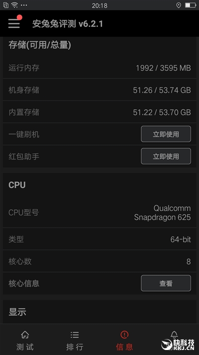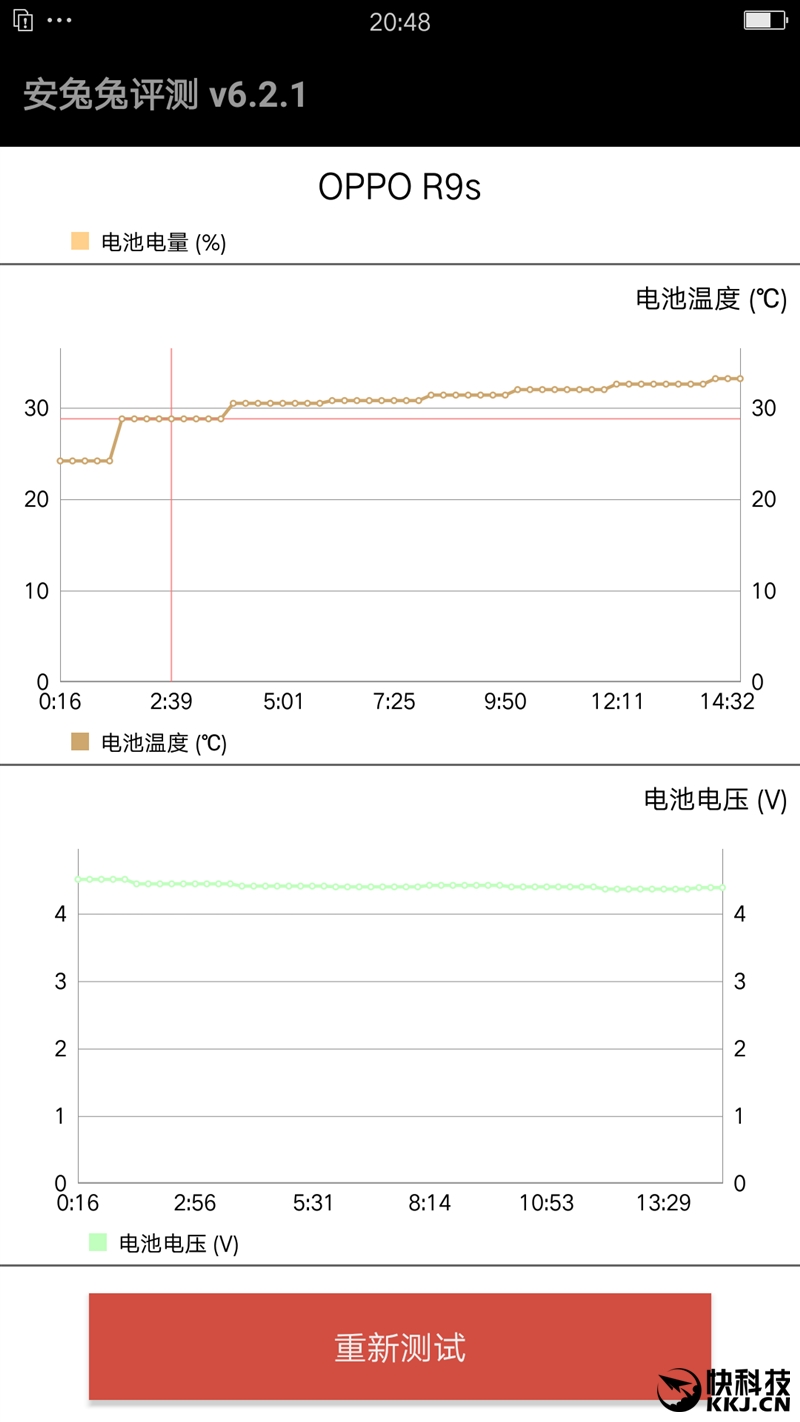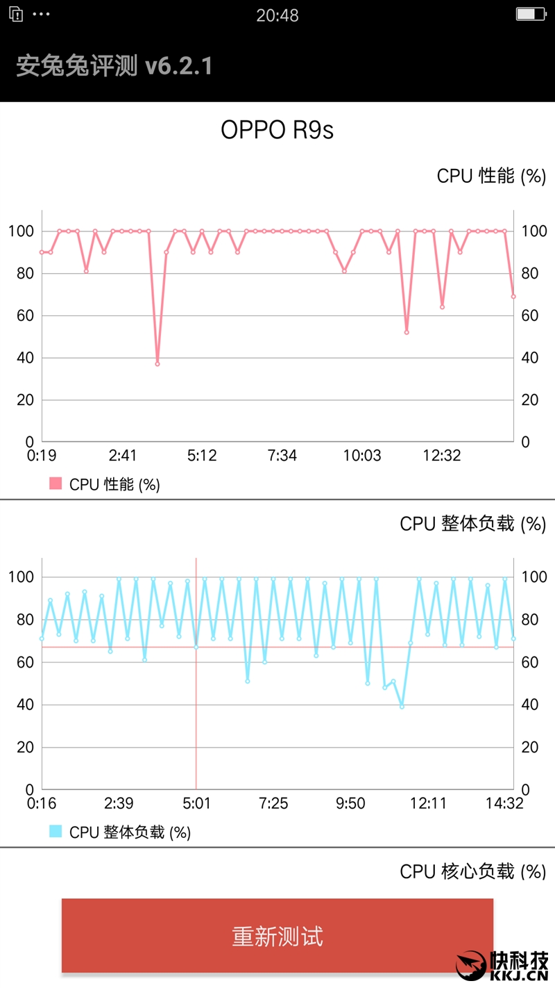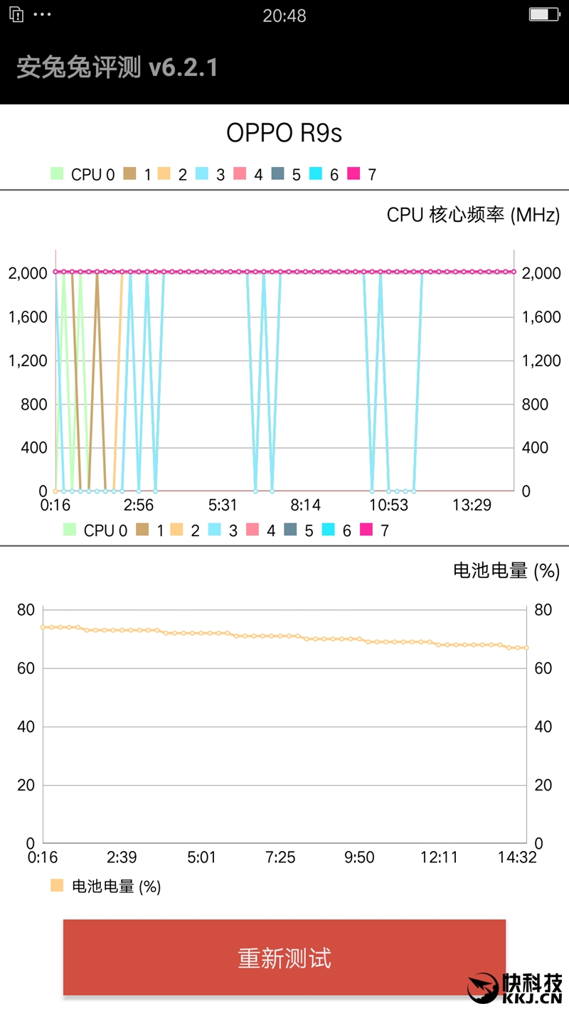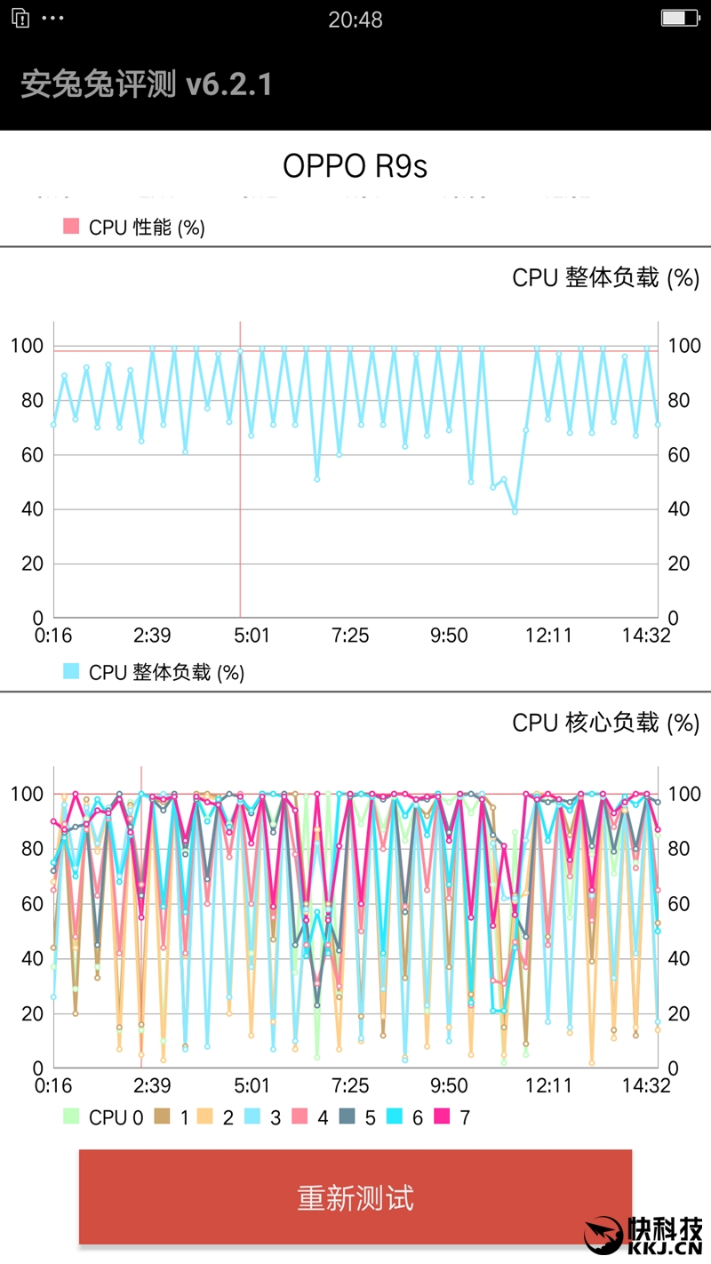 实际压力测试显示,骁龙625效率非常高,大部分时候都可以保持100%的完整性能,不过测试中会随着温度的升高略微降频,但测试基本都在1.8-2GHz之间波动,效率很高。需要说明的是,性能测试过程中R9s的温度控制不错,CPU满载情况下机身温度只是温热