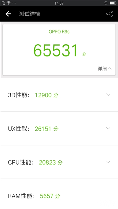 从实际测试的情况看,R9s安兔兔的跑分为65531,基本属于骁龙625处理器的正常水平,相比之前R9的MT6755性能提升了有14000分,这主要是GPU性能的加强,毕竟Adreno 506还是要略强于Mali-780(3D性能提升在50%以上),另外骁龙625的CPU性能也要强于MT6755,性能提升在20%左右,在4GB内存的加持下,R9s胜任一般游戏都没有任务问题。