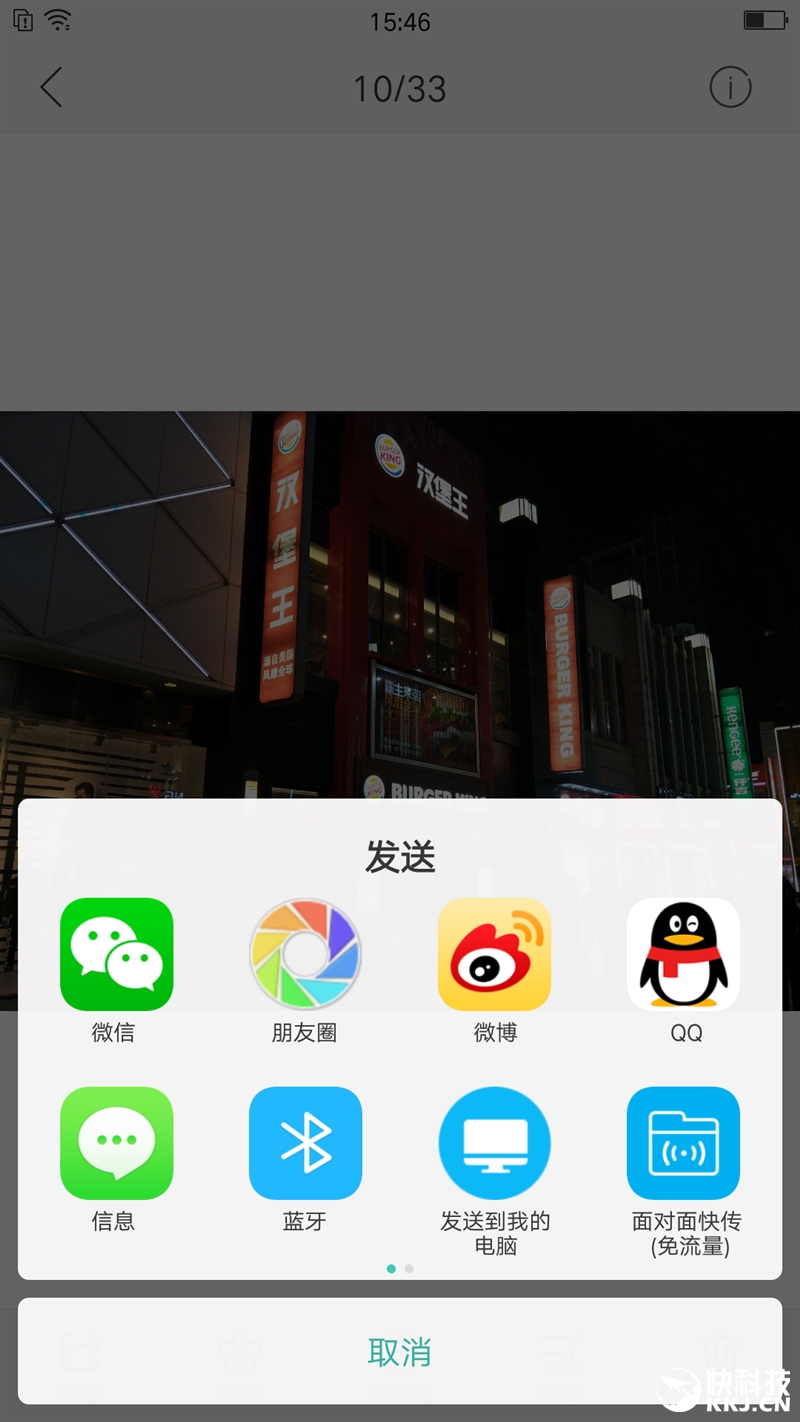 R9s还提供高级拍摄模式,其有“超清画质”“绚彩滤镜”“Gif动画”“双重曝光”“专业模式”六种可选,另外要说的是,R9s拍摄后的样张分享起来也格外方便,点击发送后可以瞬间完成微博、QQ、朋友圈等社交平台的分享晒图。