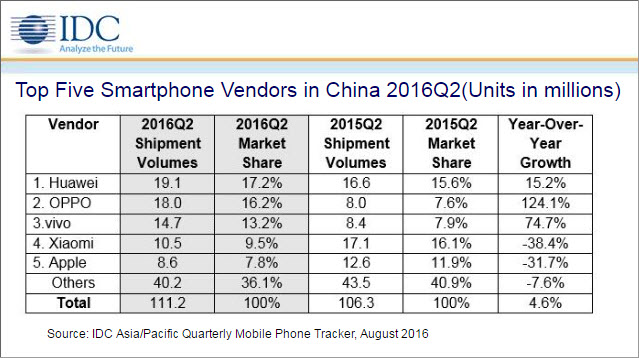 IDC国内品牌Q2份额:华为OPPO vivo前三(数据来自IDC)