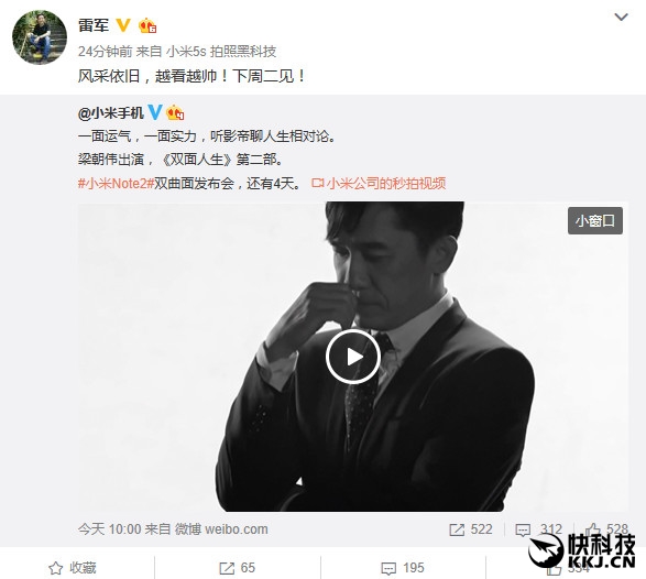 梁朝伟代言小米Note 2宣传片 雷军:越看越帅