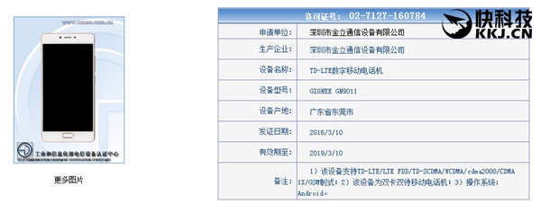 工信部认证信息显示,该机型号为GN9011,支持TD-LTE/LTE FDD/TD-SCDMA/WCDMA/CDMA2000/CDMA 1X/GSM制式,即全网通,还有双卡双待。