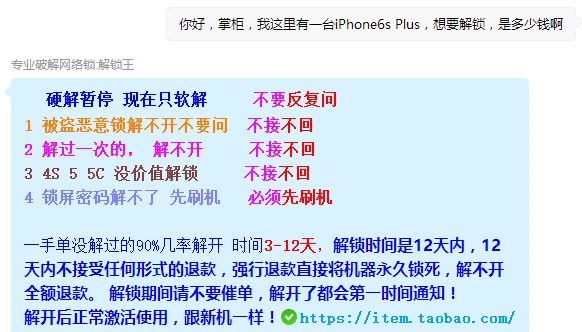 看来,自己拆装芯片的希望是破灭了。不过在万能的淘宝上,仍然存在很多商家,打着可以“硬解”iPhone 的旗号。不过,当雷锋网记者前去询问的时候,店主纷纷表示现在硬解的业务暂停了,因为“效果不好”。