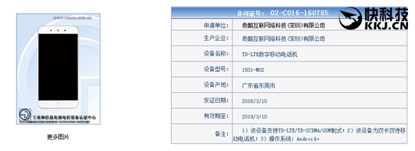 工信部认证信息显示,该机型号为“1501-M02”,双卡双待,但仅支持移动4G制式,而外观方面最引人注目的就是正面上方的“三只眼”,分别是距离传感器、听筒和前置摄像头。一般手机听筒都是长条形的,这里做成个圆形也是十分别致。