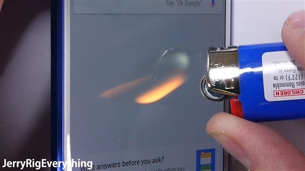 在高温测试当中,用打火机炙烤屏幕后,LCD屏幕没有出现融化变形,但却留下了明显的像素点损坏,被烧烤区域无法正常显示色彩。