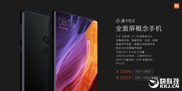 小米MIX采用的是6.4英寸显示屏,搭载骁龙821满血版处理器,内置4/6GB内存和128/256GB机身存储空间,提供500/1600万像素前后摄像头,电池容量4400mAh,支持双卡双待全网通和后置式指纹识别。