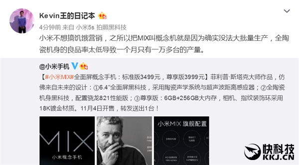 业内人士@Kevin王的日记本刚刚在微博上表示,小米之所以把MIX称作是概念机是因为该机的陶瓷外壳产能实在有限(良品率太低),每个月大约只有一万多台产量。