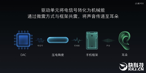 对于公布的这款小米概念机,小米强调用陶瓷声学系统替代传统的听筒,其通过压电陶瓷将电信号转化为机械能,通过机身导声,无听筒也能接听电话,而超声波替代了传统红外距离感应器,这样的好处就是正面开孔,依然防误触。