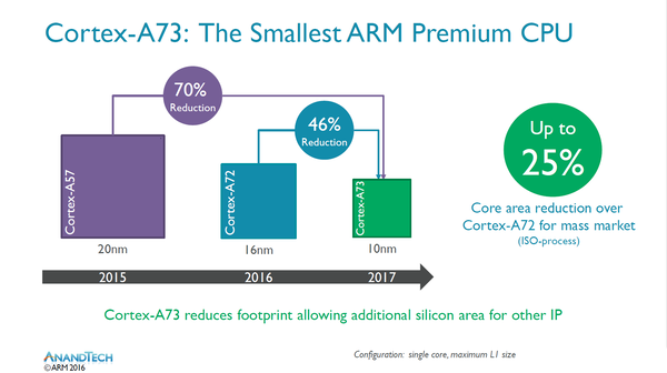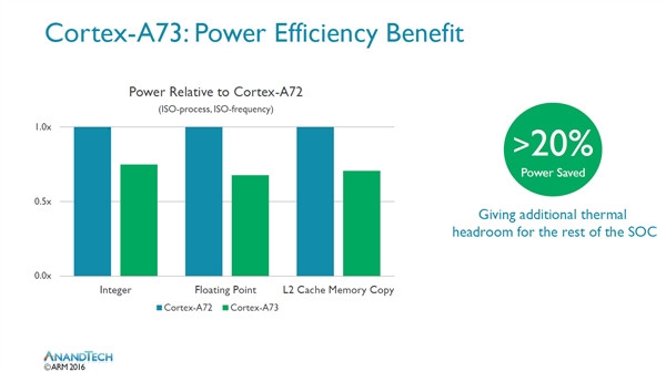 笔者认为,2017年的手机芯片市场依然和16年的相类似,消费者/手机厂商不再盲目追求峰值性能,而是更多地考虑芯片的发热、功耗表现,这就需要芯片厂商在CPU大小核结构、微核架构上作平衡搭配。Cortex-A73作为arm的全新“大核心”,以A17为基础优化了流水线、资源接口等等,使其在同频、同制程工艺下相比A72节省20%的耗能,核心面积也大大缩小。