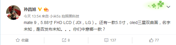 而分析师孙昌旭则表示,Mate 9的屏幕准确尺寸是5.88英寸,供应商是JDI和LG,而另一款曲面屏版本的尺寸是5.5英寸,采用的是三星OLED显示屏,但是否发布还不清楚,命名更不清楚。