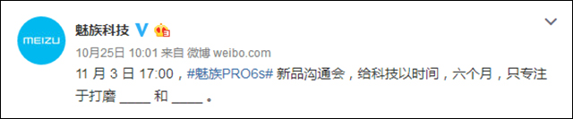 那么,既然配置无变化,魅族PRO6s到底“s”在哪呢?从魅族官方的微博图中的“六个月,只专注于打磨 ____ 和 ____ ”可以看出 ,此次魅族PRO6s将会在两个方面有比较大的升级。