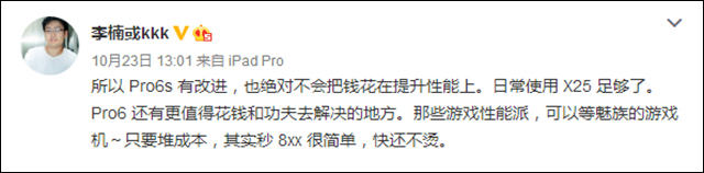 至于手机的配置,李楠早前也通过微博表示,“PRO6s有改进,也绝对不会把钱花在提升性能上。日常使用 X25足够了。 PRO 6还有更值得花钱和功夫去解决的地方。”即暗示了它将沿用魅族PRO 6的联发科Helio X25处理器。