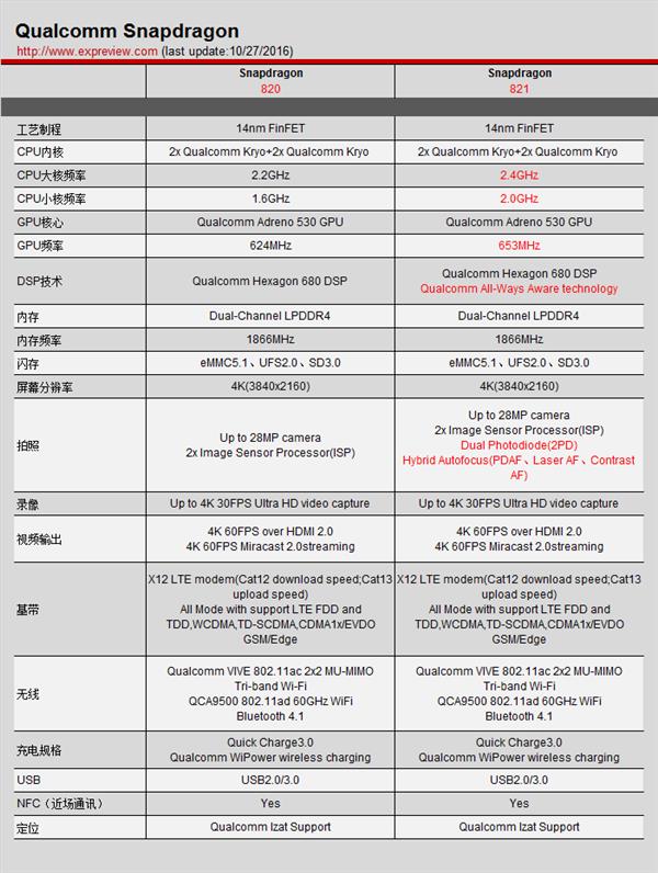 首先来了解骁龙820和骁龙821的基本参数对比。