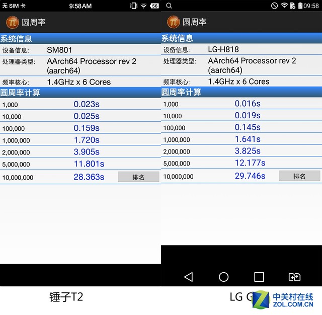 首先要强调的是,在做每项测试时手机后台均会清空,且两机功能处于相同关闭或开启状态(蓝牙、Wifi等)。通过计算圆周率后1000万位的速度,体现CPU性能,同时该软件通过并行计算可充分利用每个核心。图中能够看到在圆周率1000万位的计算上,锤子T2为28.363秒、LG G4为29.746秒,锤子T2表现更优。