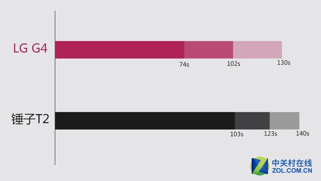两机第一轮成绩LG G4大幅领先,用时74s依次开启完毕所有App;锤子T2第一轮则用时103s。到了后两轮,由于App都保留在了后台,所以基本都可以秒开,两机均未出现内存不足“杀App”的情况。后两圈LG G4均为28s,而锤子T2分别为20s和17s,总时间上两机分别是130秒和140秒,LG G4领先。