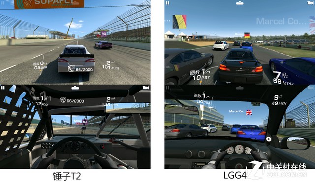游戏方面可以说两机在体验上是看不出差距的,当然这里指的游戏体验并不涉及LG G4的2K分辨率屏幕有多好,仅是流畅度方面的体验。游戏加载速度上除了上面提到的真实赛车3开启速度差异较大外,其余游戏开启速度和每关间的加载速度也都大致相近,某些游戏锤子T2稍快,某些游戏则是LG G4稍快。