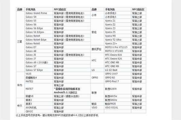 这里主要罗列国内正式发售和正常应用到NFC的手机型号。值得注意的是,小米在今年新机上宣传了全功能NFC,但小米的NFC不支持NFC-SIM模拟公交卡和移动支付,小米用自家的小米支付和小米公交卡取代这两项功能,所以这个全功能NFC略有争议。