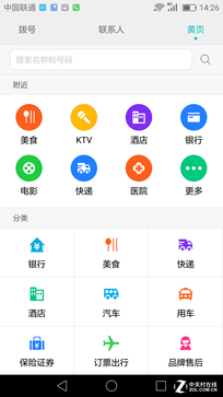在生活服务当中,荣耀8可以基于用户的位置信息提供生活相关的各种推荐指导,包括手机充值、海外购、订酒店、打车、看电影等等。此外,用户也可以在通讯录的“黄页”当中看到全面的生活服务类信息,找餐厅、看电影等不愁找不到地方。