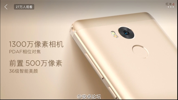 配置方面,红米4采用了5寸全高清屏幕、骁龙625八核处理器、1300万像素后置摄像头(PDAF)、500万像素前置摄像头(36级智能美颜)、6模18频双卡全网通3.0(三选二/VoLTE/600Mbps)。